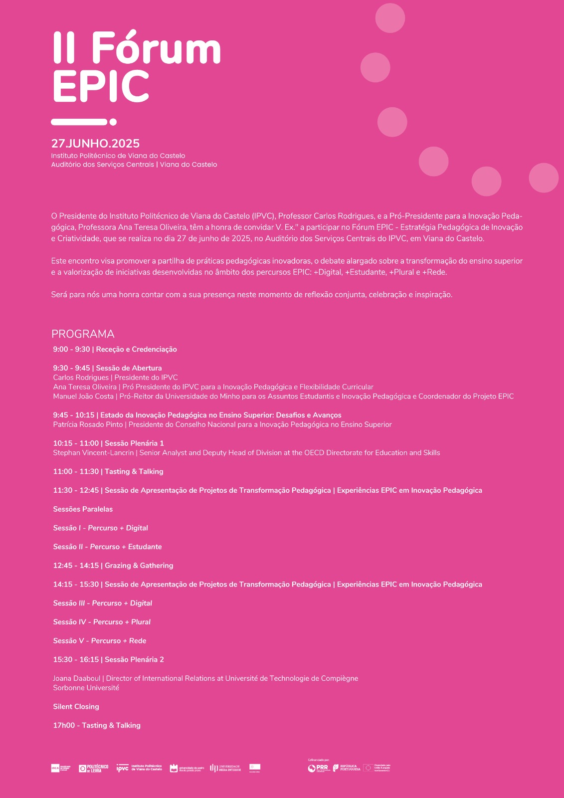 II Fórum EPIC ObjetivosO EPIC Fórum visa reforçar o sentimento de comunidade, disseminar os projetos de inovação desenvolvidos no contexto das atividades do projeto e a inspiração de outros para os processos de inovação.